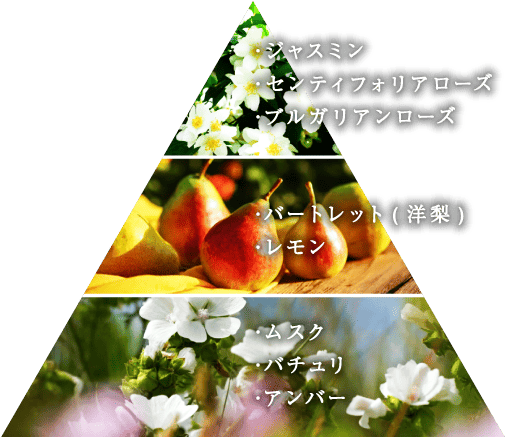 みずみずしい洋梨を思わせる、ほんのりとした優しい甘さと、フリージアのフレッシュな爽やかさを融合。豊潤でエレガントな余韻を演出します。