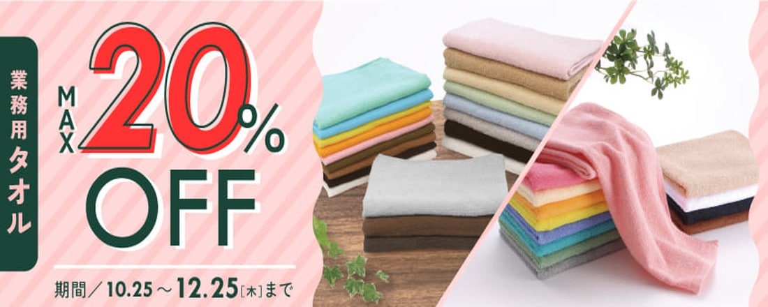10/25〜12/25までのご注文分まで限定! 期間中は「SR国産タオル」と「スレンカラータオル」が最大20%プライスダウン! 是非この機会に新しいタオルで信念をお迎えください!
